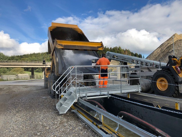 Le chauffeur recule son camion, lève sa benne face à l’aire de lavage et s’installe ensuite en toute sécurité sur le poste opérateur.