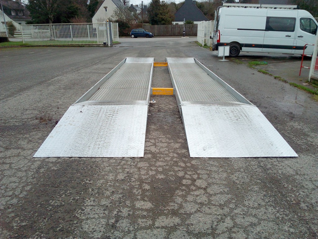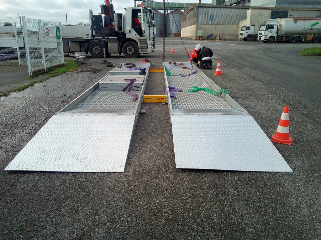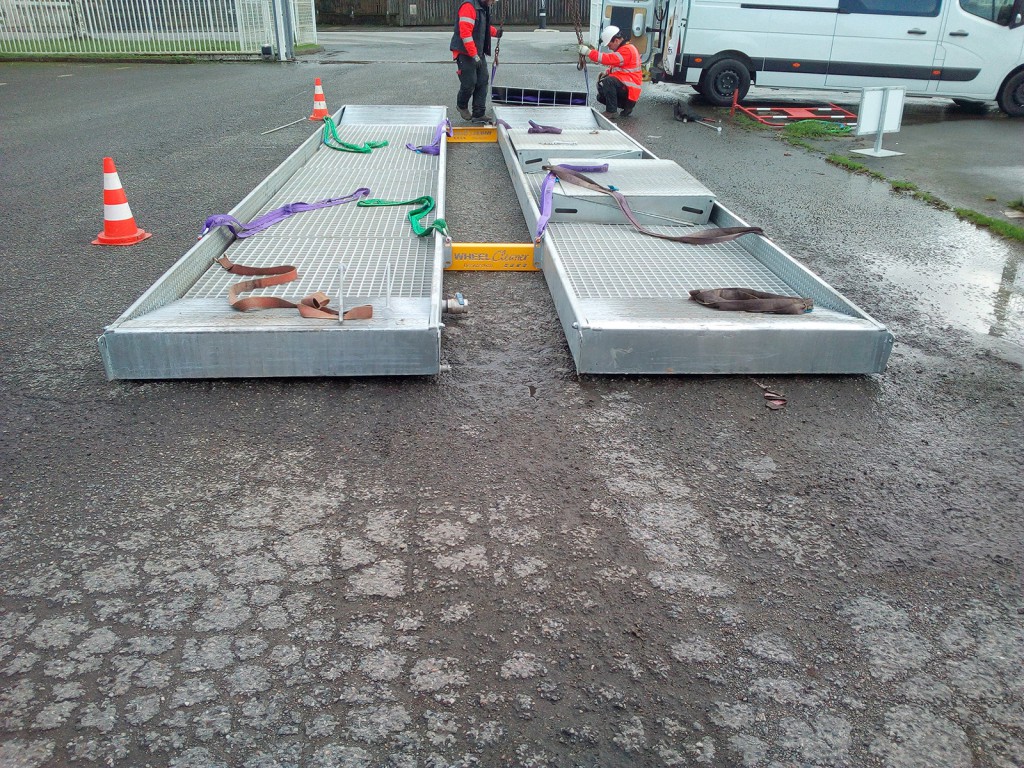Les engins traversent le bassin sans s'arrêter, en passant sur un chemin de roulement galvanisé.